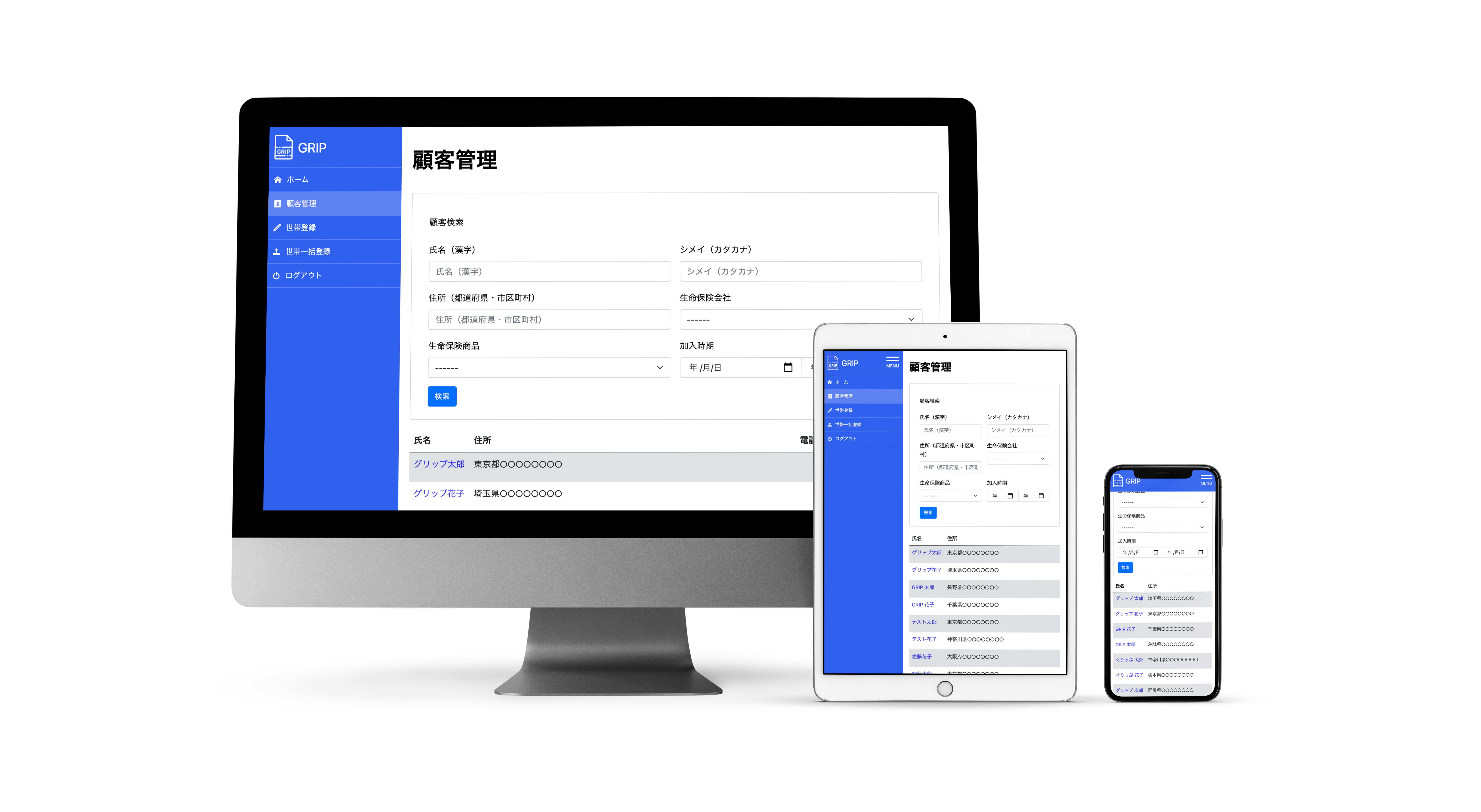 お名前、住所、生命保険商品などでお客様を検索することができます。